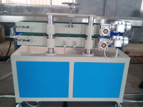 牽引裝置,包括牽引機架,所述牽引機架上平行設置有上履帶和下履帶,且它們之間具有容納管材的間隙,所述下履帶和上履帶由傳動機構帶動實現(xiàn)同步轉動,且傳動機構連接了一個設于牽引機架上的驅動電機,由驅動電機提供動力。本實用新型整個裝置只采用一個電機驅動履帶轉動,成本低,耗能低,而且能夠實現(xiàn)上下履帶的同步轉動,對管材的牽引平穩(wěn),整體結構緊湊,占用空間小。